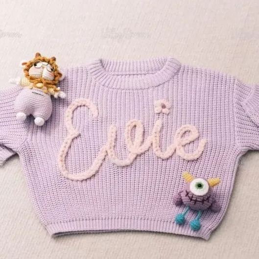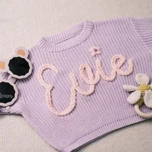 Customized personalized baby/toddler sweaters, hand embroidered with the child's cursive name on the chest or back using coarse or super coarse yarn.