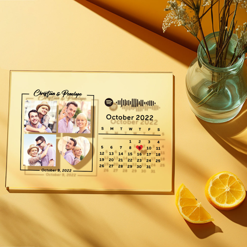 Celebrate your love with our custom calendar acrylic plaque, a perfect blend of memories and music designed especially for couples. This elegant and modern plaque combines your favorite photo, a personalized calendar, and a Spotify code to create a unique and meaningful anniversary gift.