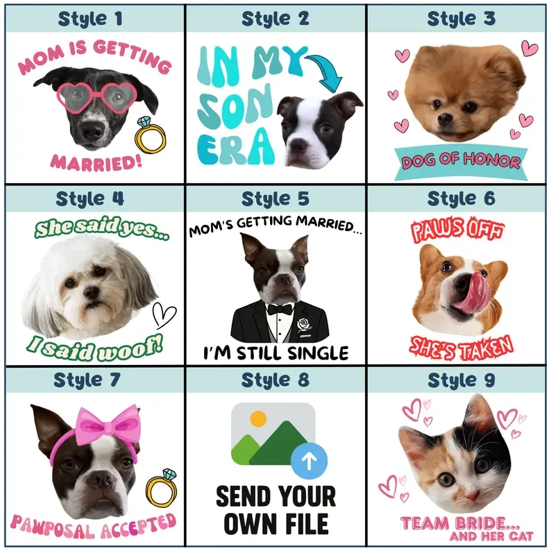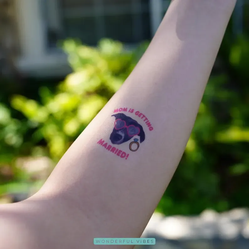 Make your furry friend part of the celebration! Our custom temporary tattoos turn your pet’s face into a fun, adorable design for bachelorette parties, weddings, or just to show off how much you love them.