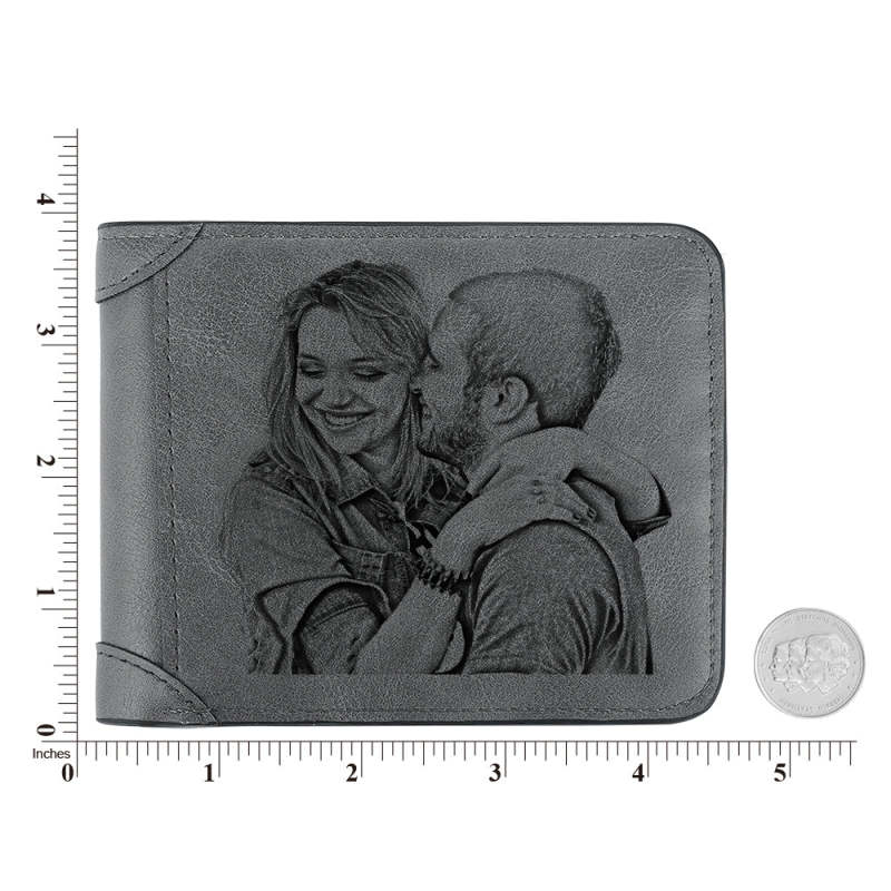 Men's Custom Photo Engraved Wallet Grey Leather Personalized Wallets