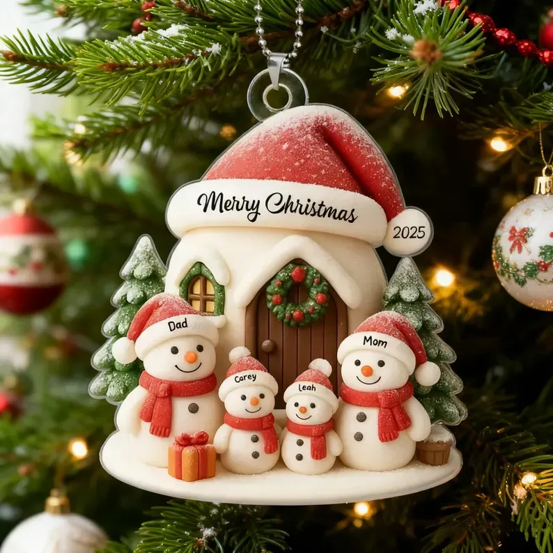 The acrylic material ensures vibrant colors and sharp details, making each customized element stand out beautifully. Whether hung on the Christmas tree, displayed on a mantel, or used as a window decoration, this snowman family scene captures the magic of Christmas and the warmth of family love.