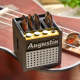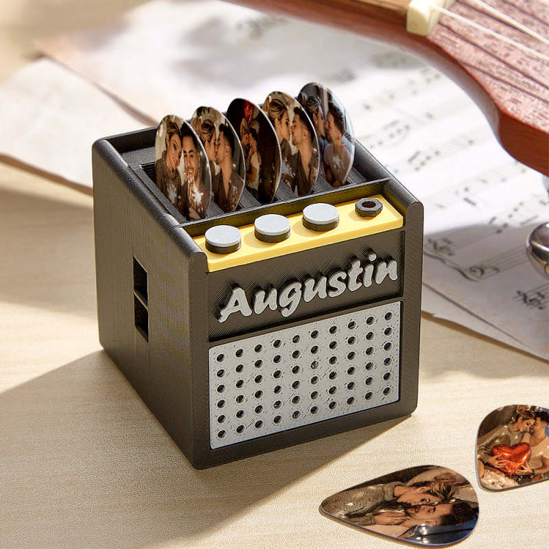 Store your guitar picks in this personalized holder that looks like a classic amp. Perfect for any music enthusiast looking to add a rock 'n' roll touch to their space.