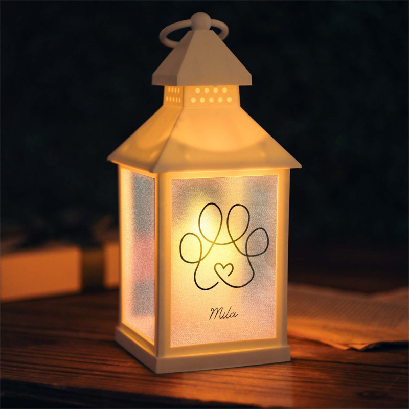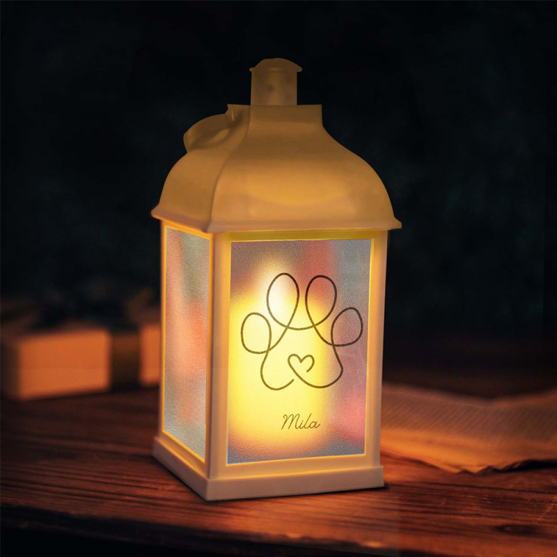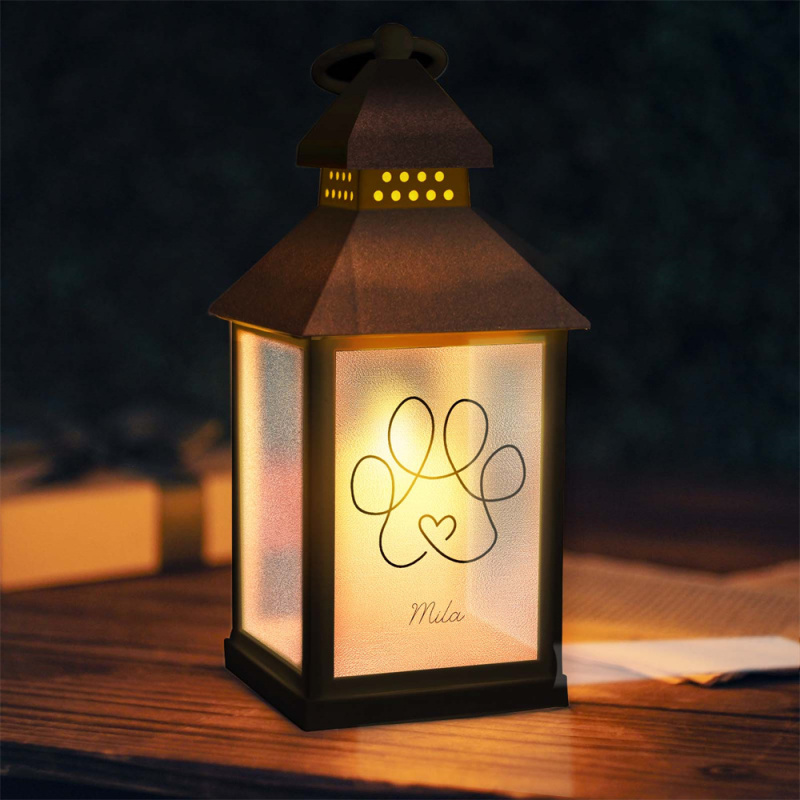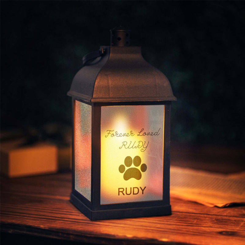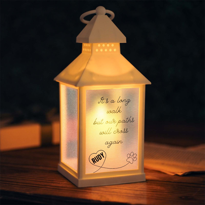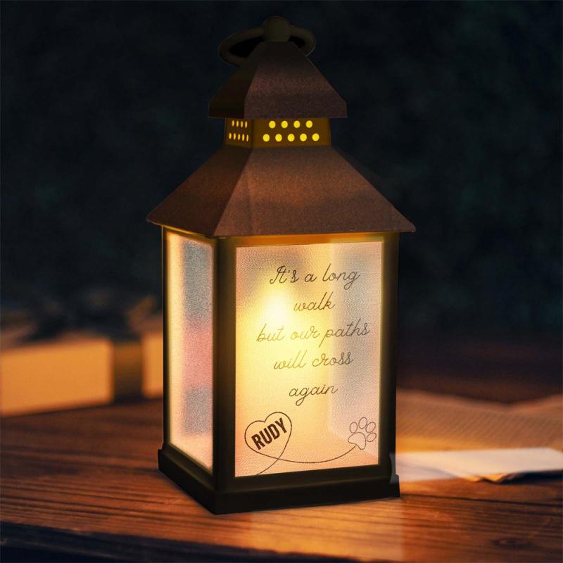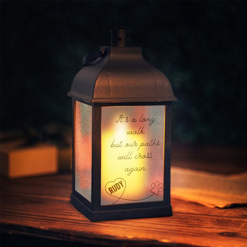 Our Personalized Lantern is a heartfelt tribute to cherished pets. Emitting a warm glow, this lantern serves as a Pet Memorial Gift, eternally keeping memories alive. Crafted with care, it comes in various elegant styles - Farmhouse Black, Farmhouse White, Dome Top Black, Dome Top White. Engraved with the touching words "Always in Your Heart," "In Memory," and "Forever Loved," it offers solace in times of Dog Pet Loss and Bereavement. A beautiful way to honor your beloved pet's memory, reminding us of the Long Walk we shared.