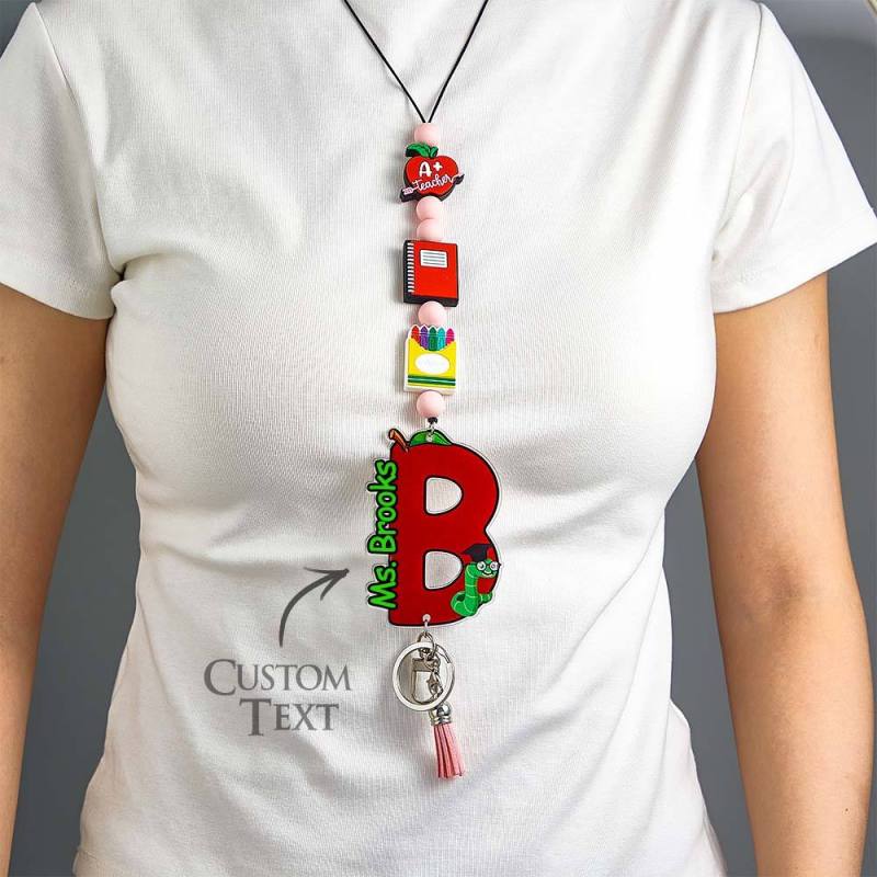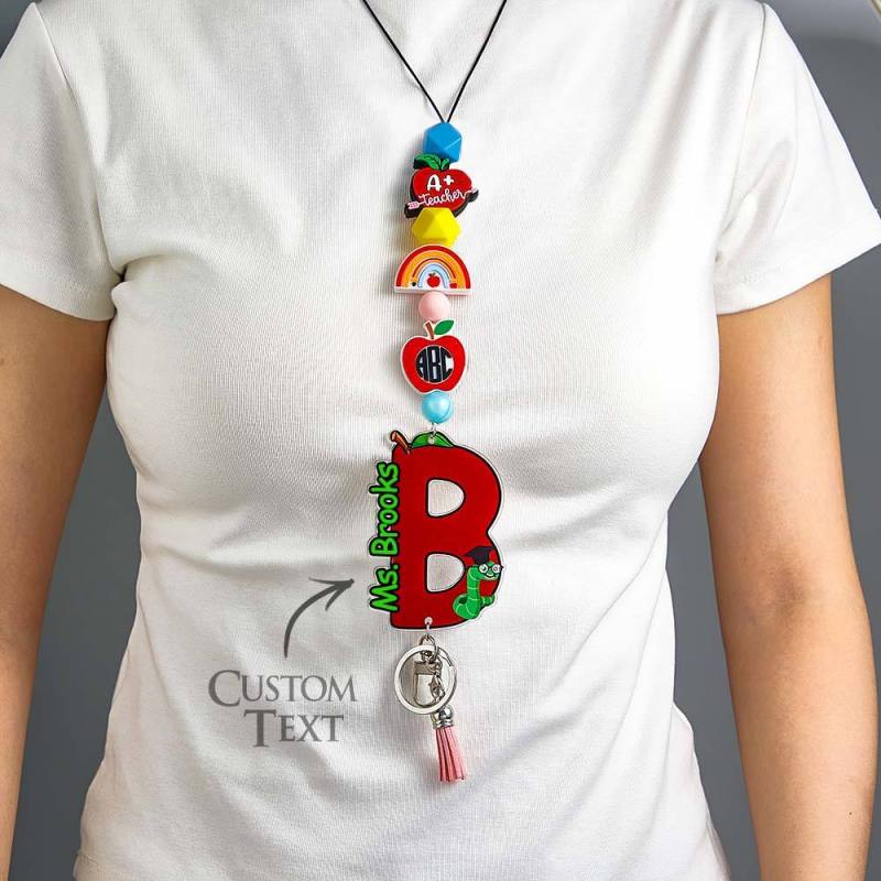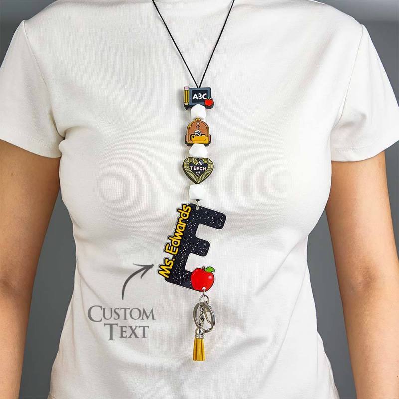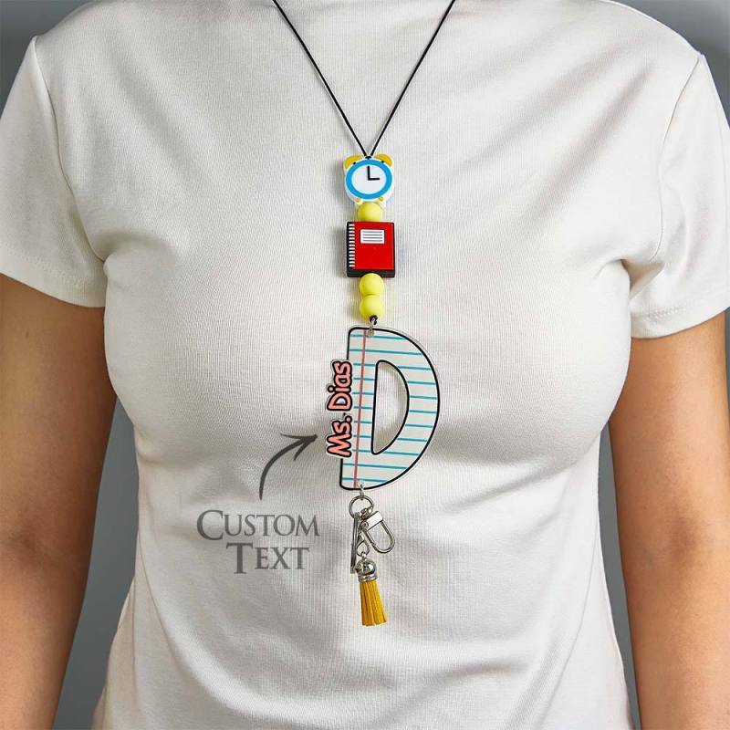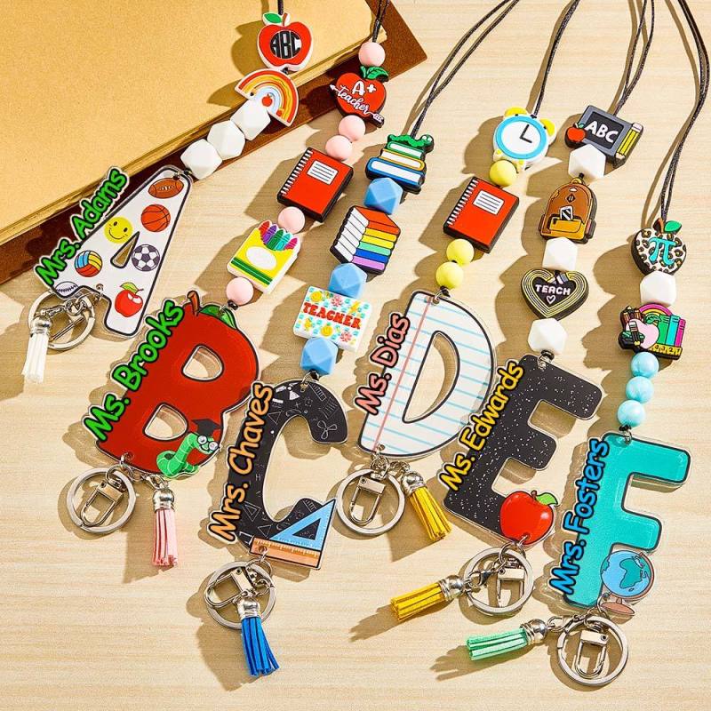 Elevate your style in the classroom with our Personalized Teacher Lanyard! This handmade lanyard features a glossy acrylic charm infused with vibrant ink, approximately 2.5" in length. Choose from school supply-themed initials like notebook paper, pencil, apple, ruler, and composition notebook. Crafted with coordinating silicone and acrylic beads on paracord 95, this lanyard ensures durability and style.?