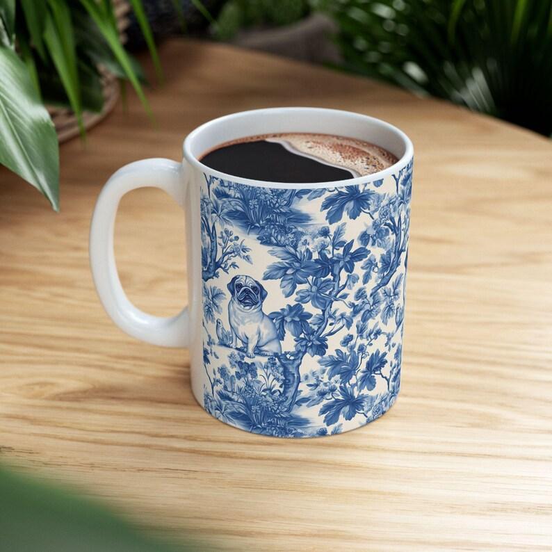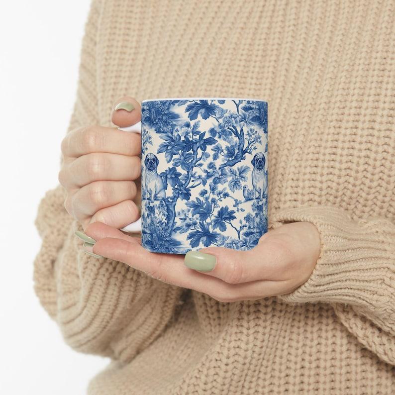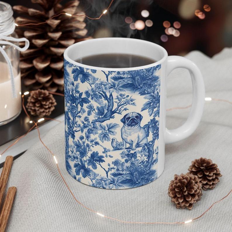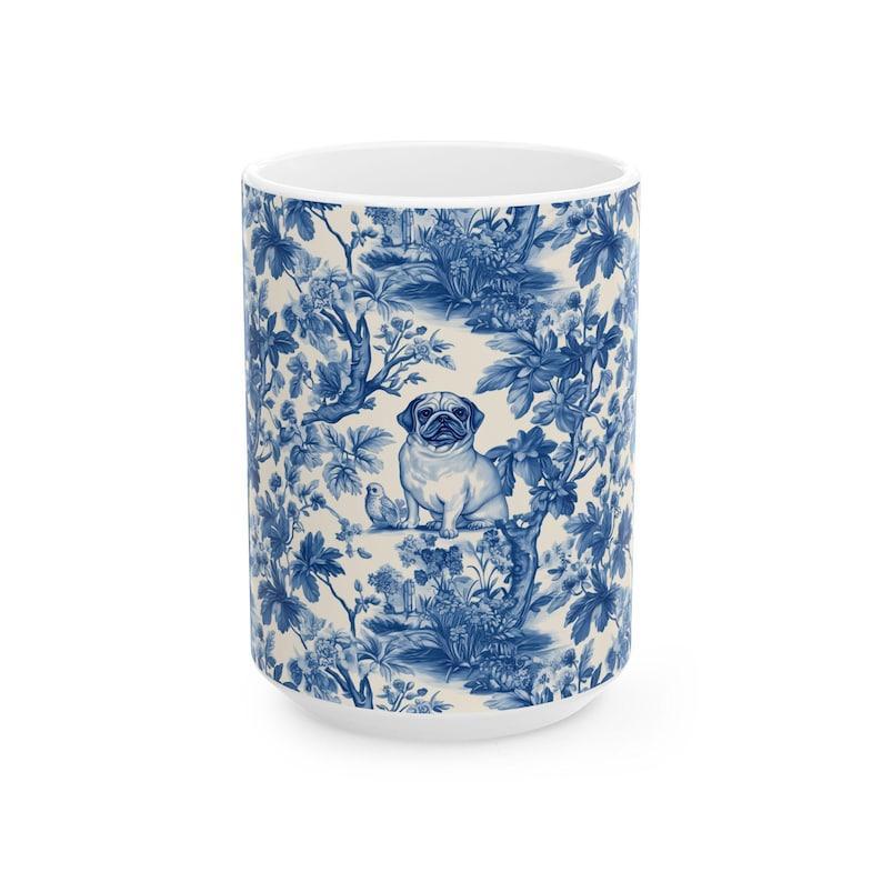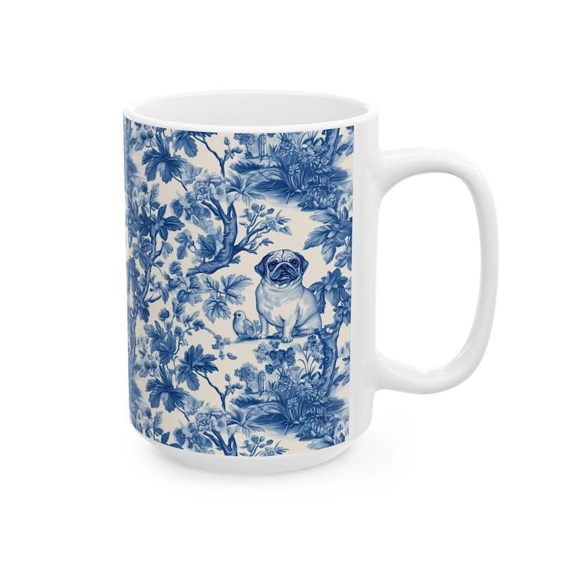 Our elegant Pug Blue French Toile Mug combines classic style with canine charm, perfect for any Pug lover! Featuring a blue and ivory toile pattern with Pugs, this mug brings timeless sophistication to your coffee or tea routine. The delicate, French-inspired design makes it a unique addition to any collection or a thoughtful gift.