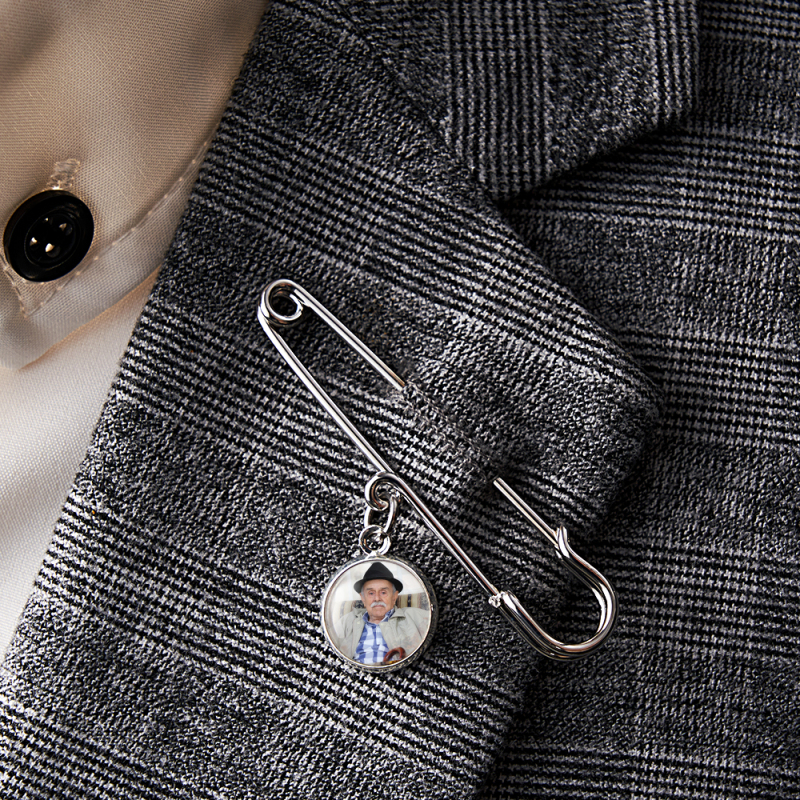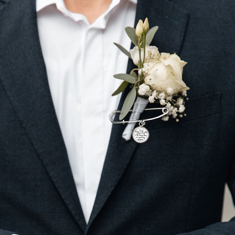 Our memorial charm is a thoughtful way to carry the memory of your loved ones with you on your special day. It is designed to be attached to a bridal bouquet or pinned to a suit or jacket pocket.